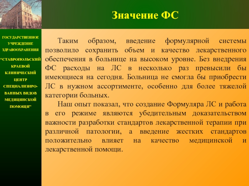 Четвертый и основной раздел совершенствования лекарственного обеспечения – организация формулярной системы медикаментозного обеспечения.