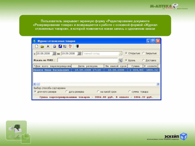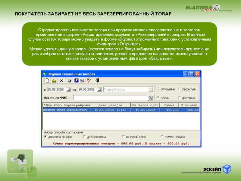 При работе с экранной формой «Журнал отложенных товаров» пользователь работает с заказами на «бронирование / доставку», выбирая нужный диапазон дат и используя переключатели состояний заказа. Состояние «Открытые» - заказ не выполнен, «Закрытые» - заказ выполнен, «Бронь» или «Доставка» - соответственно тип заказа.