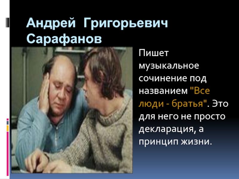 Пишет музыкальное сочинение под названием "Все люди - братья".