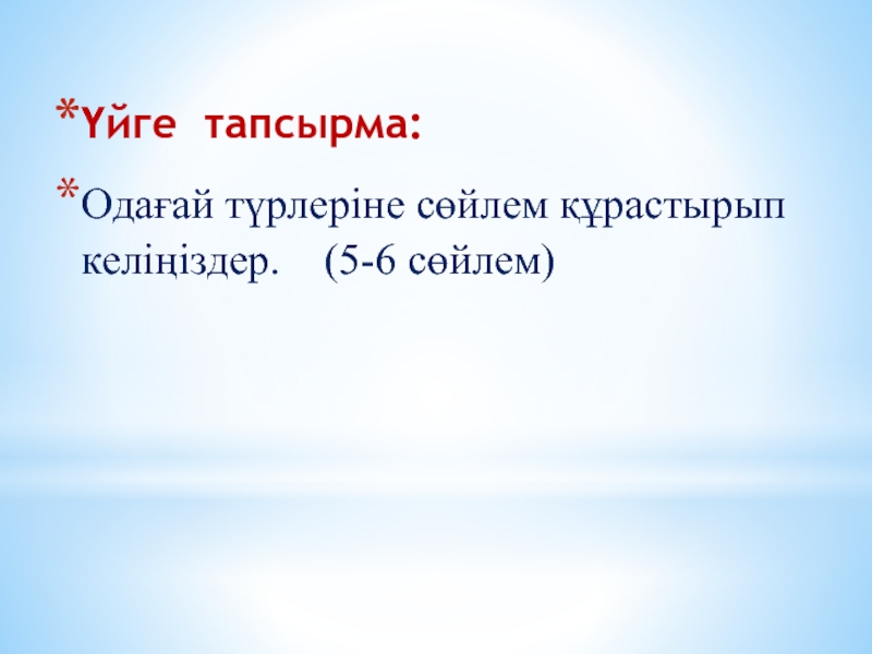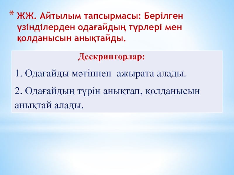 Слайд 5ЖЖ. Айтылым тапсырмасы: Берілген үзінділерден одағайдың түрлері мен қолданысын анықтайды.