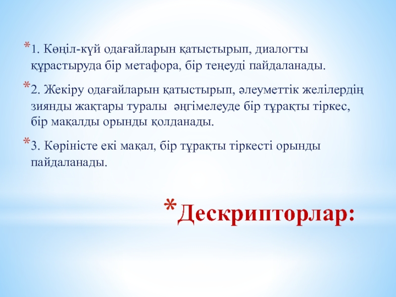 1. Көңіл-күй одағайларын қатыстырып, диалогты құрастыруда бір метафора, бір теңеуді