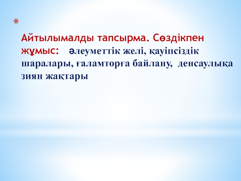 Слайд 4 Айтылымалды тапсырма. Сөздікпен жұмыс: әлеуметтік желі, қауіпсіздік шаралары, ғаламторға байлану,