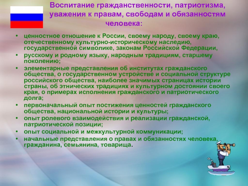 ценностное отношение к России, своему народу, своему краю, отечественному культурно-историческому наследию, государственной символике, законам Российской Федерации,