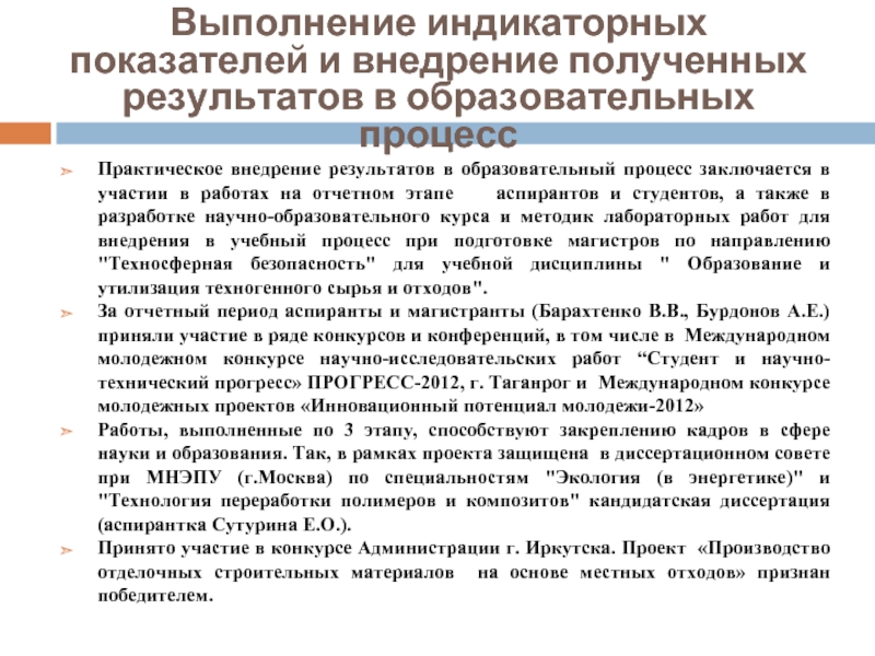 внедрение результатов в образовательный процесс заключается в участии в работах на отчетном этапе аспирантов и студентов, а также в разработке научно-образовательного курса и методик лабораторных работ для внедрения в учебный процесс при подготовке магистров по направлению "Техносферная безопасность" для учебной дисциплины " Образование и утилизация техногенного сырья и отходов".