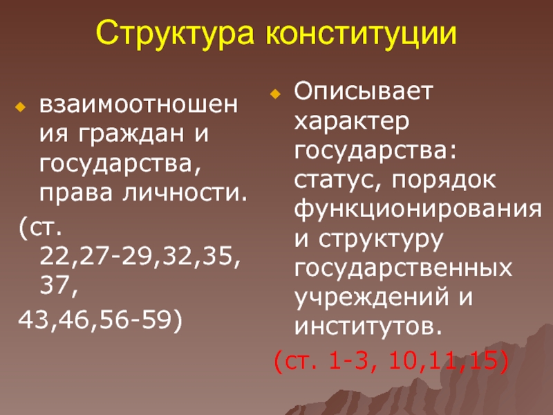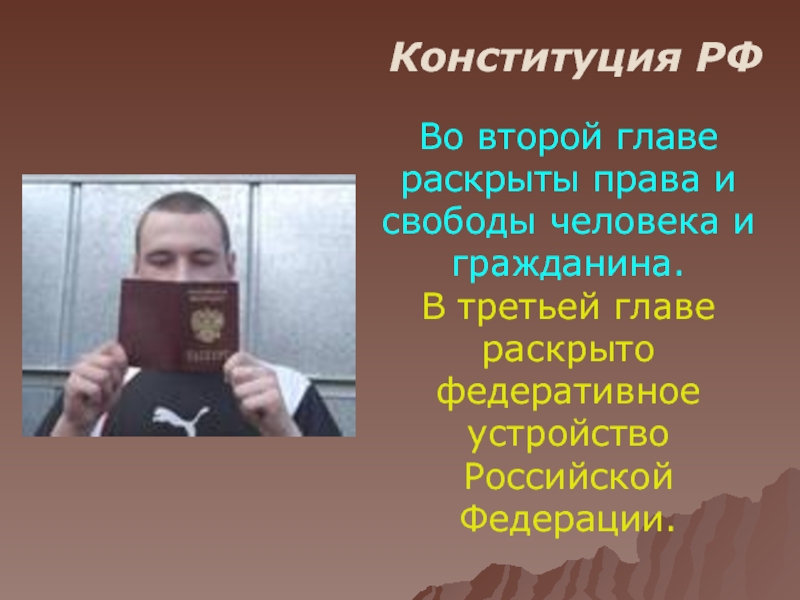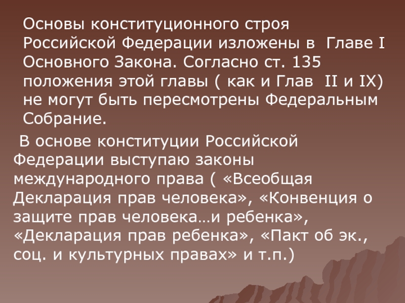 В основе конституции Российской Федерации выступаю законы международного права ( «Всеобщая Декларация прав человека», «Конвенция о защите прав человека…и ребенка», «Декларация прав ребенка», «Пакт об эк., соц. и культурных правах» и т.п.)
