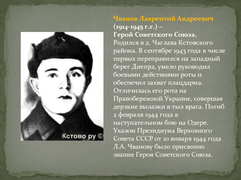 Кстовского района. Его минометный расчет отличился в январе 1945 года при форсировании Вислы. По тонкому льюду бойцы достигли левого берега, подавили огонь 3-х станковых пулеметов, пушки и уничтожили 70 немцев.
