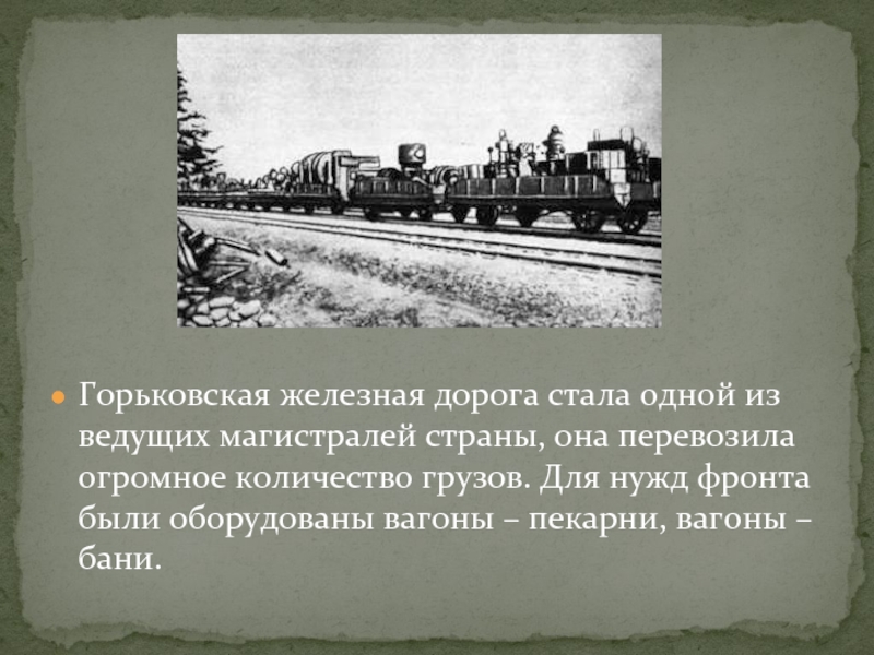 огромное количество грузов. Для нужд фронта были оборудованы вагоны – пекарни, вагоны – бани.
