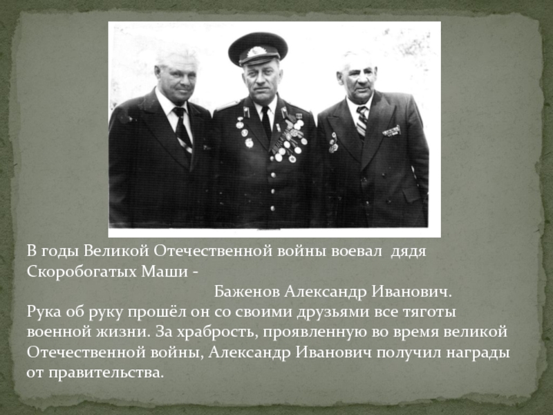 Рука об руку прошёл он со своими друзьями все тяготы военной жизни. За храбрость, проявленную во время великой Отечественной войны, Александр Иванович получил награды от правительства.