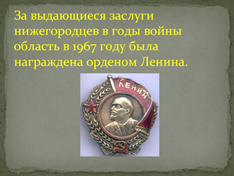 Слайд 10За выдающиеся заслуги нижегородцев в годы войны область в 1967 году