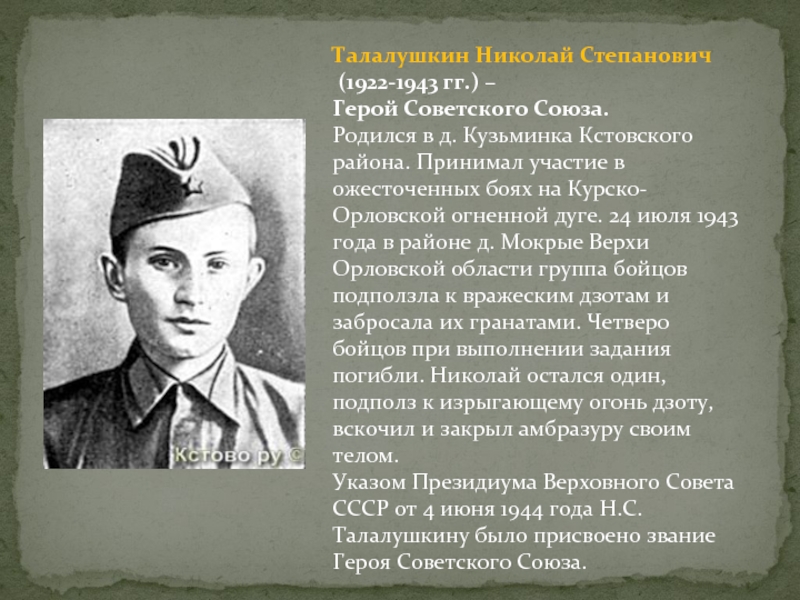 Студенец Кстовского района. На самолете ИЛ-2 совершил 117 боевых вылетов. Штурмовал позиции противника на Таманском полуострове, в г. Севастополь, Белоруссии. Уничтожил десятки танков, самолетов, автомашин, до шестисот немецких солдат и офицеров.