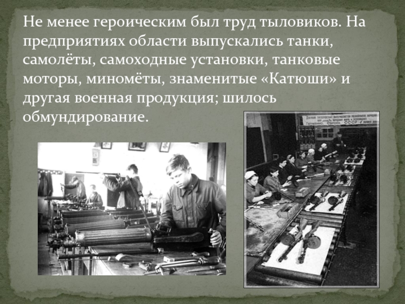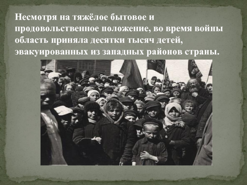Слайд 9Несмотря на тяжёлое бытовое и продовольственное положение, во время войны область