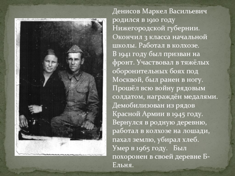 Денисов Маркел Васильевич родился в 1910 году Нижегородской губернии. Окончил 3