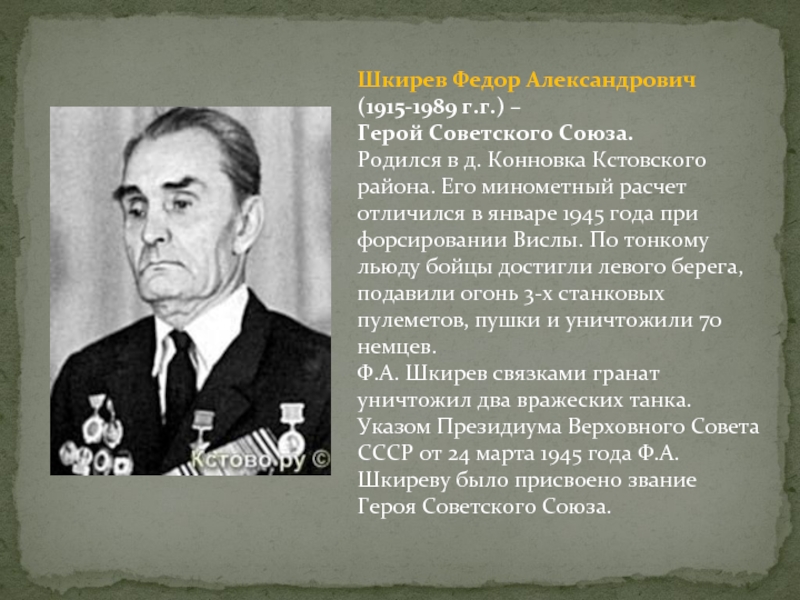 Ф.А. Шкирев связками гранат уничтожил два вражеских танка.