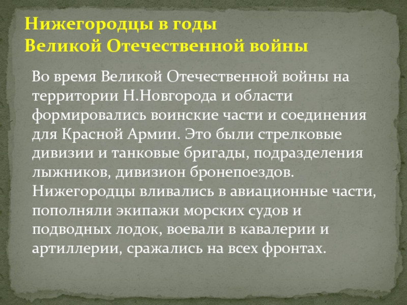 Н.Новгорода и области формировались воинские части и соединения для Красной Армии. Это были стрелковые дивизии и танковые бригады, подразделения лыжников, дивизион бронепоездов. Нижегородцы вливались в авиационные части, пополняли экипажи морских судов и подводных лодок, воевали в кавалерии и артиллерии, сражались на всех фронтах.