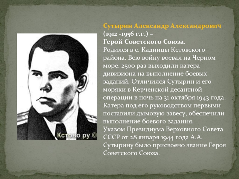 Кадницы Кстовского района. Всю войну воевал на Черном море. 2500 раз выходили катера дивизиона на выполнение боевых заданий. Отличился Сутырин и его моряки в Керченской десантной операции в ночь на 31 октября 1943 года. Катера под его руководством первыми поставили дымовую завесу, обеспечили выполнение боевого задания.