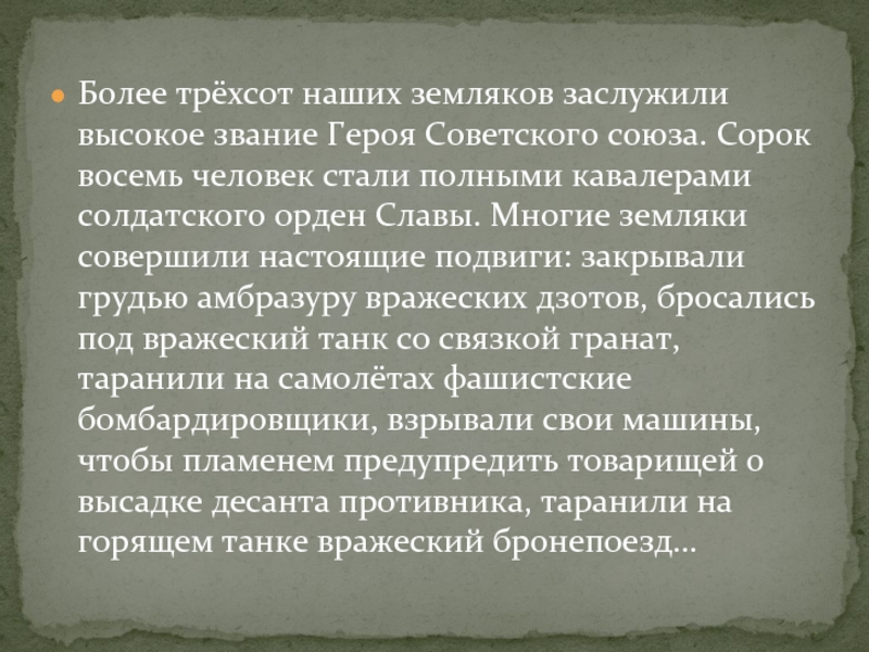 Слайд 4Более трёхсот наших земляков заслужили высокое звание Героя Советского союза. Сорок