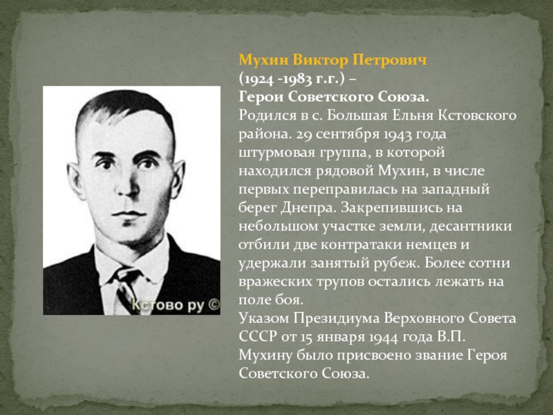 Большая Ельня Кстовского района. 29 сентября 1943 года штурмовая группа, в которой находился рядовой Мухин, в числе первых переправилась на западный берег Днепра. Закрепившись на небольшом участке земли, десантники отбили две контратаки немцев и удержали занятый рубеж. Более сотни вражеских трупов остались лежать на поле боя.