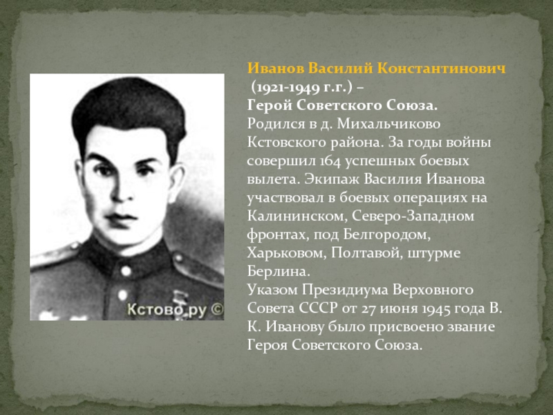 Кстовского района. За годы войны совершил 164 успешных боевых вылета. Экипаж Василия Иванова участвовал в боевых операциях на Калининском, Северо-Западном фронтах, под Белгородом, Харьковом, Полтавой, штурме Берлина.