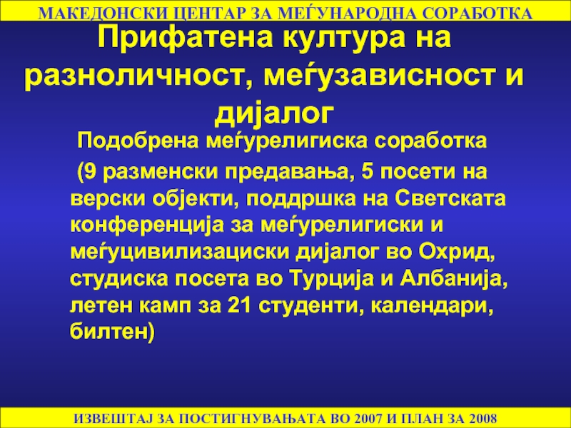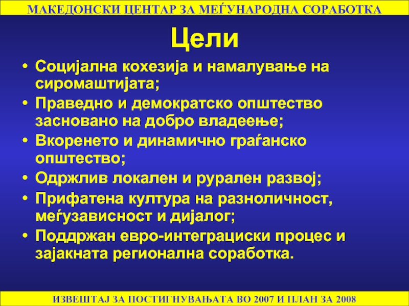 МАКЕДОНСКИ ЦЕНТАР ЗА МЕЃУНАРОДНА СОРАБОТКА ИЗВЕШТАЈ ЗА ПОСТИГНУВАЊАТА ВО 2007 И ПЛАН ЗА 2008 ГОДИНА ОТВОРЕНИ ДЕНОВИ НА МЦМС 20-26 МАЈ 2008 ГОДИНА презентация