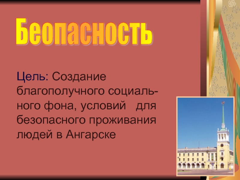 Слайд 12Цель: Создание благополучного социаль- ного фона, условий для безопасного проживания