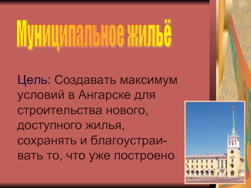 Слайд 18Цель: Создавать максимум условий в Ангарске для строительства нового, доступного жилья,