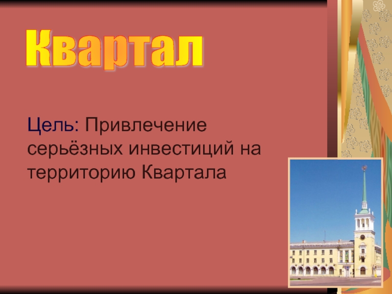 Слайд 15Цель: Привлечение серьёзных инвестиций на территорию Квартала