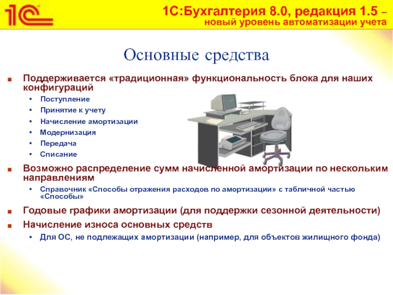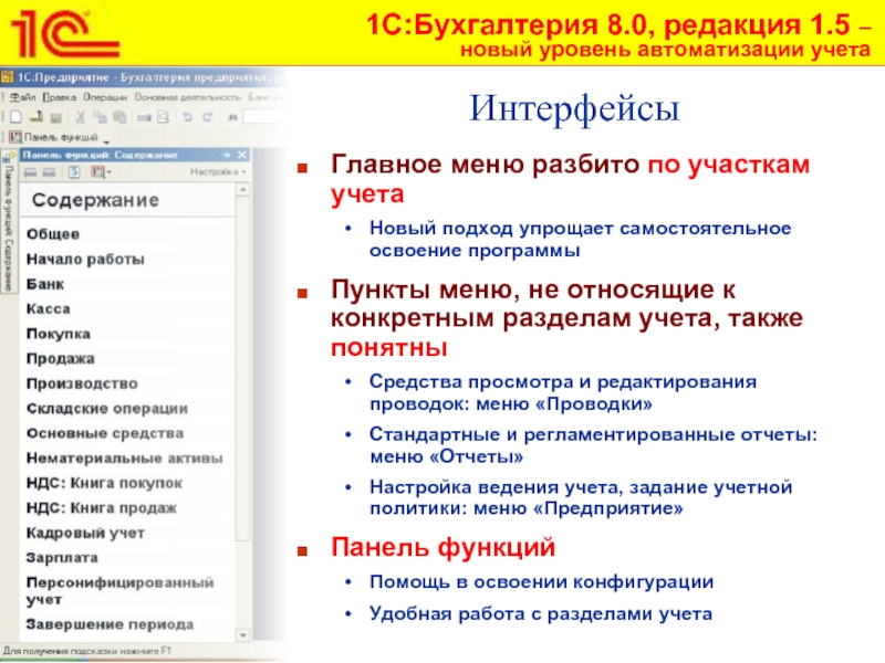Сохранена преемственность с «1С:Бухгалтерией 7.7» в методических решениях и технологии работы: