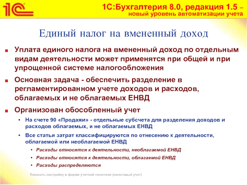 Основная задача - обеспечить разделение в регламентированном учете доходов и расходов, облагаемых и не облагаемых ЕНВД