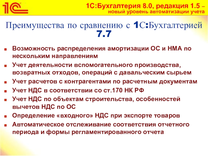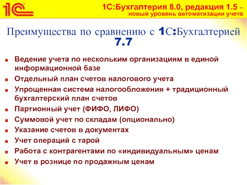 Слайд 34Преимущества по сравнению с 1С:Бухгалтерией 7.7