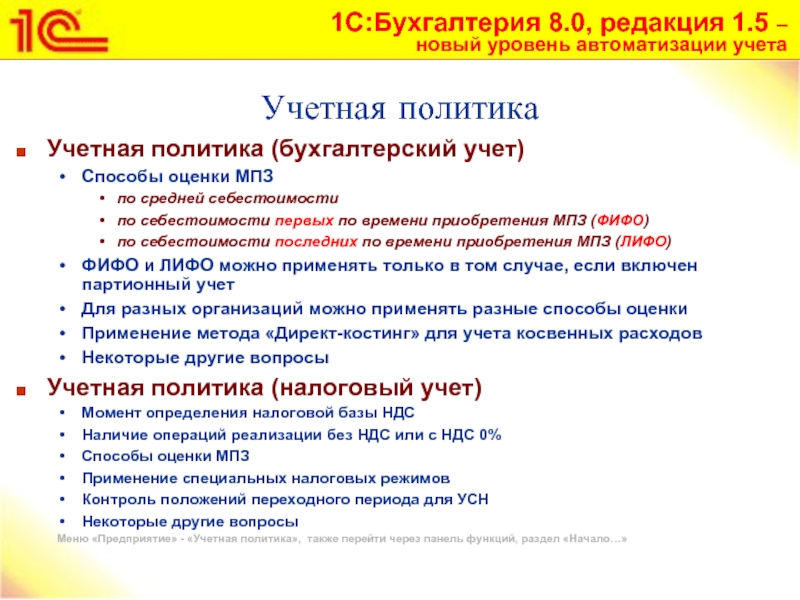 Меню «Предприятие» - «Учетная политика», также перейти через панель функций, раздел «Начало…»