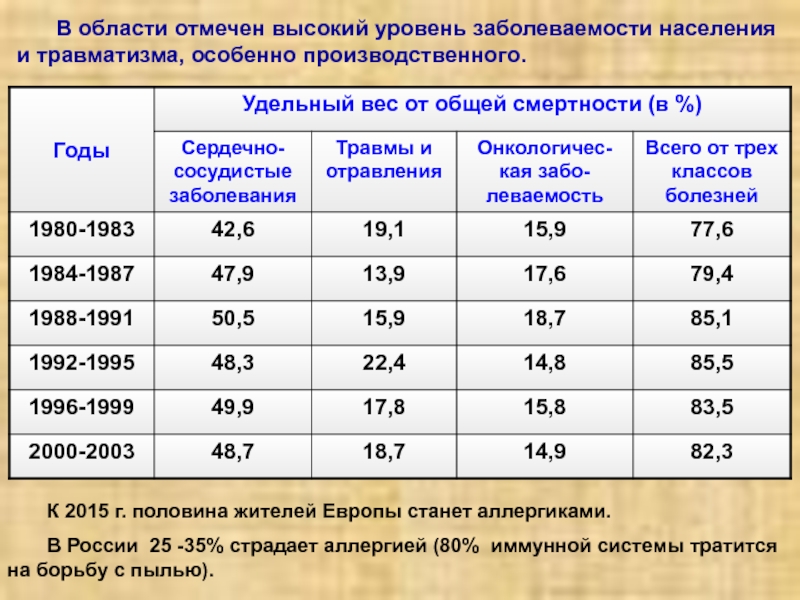 В области отмечен высокий уровень заболеваемости населения и травматизма, особенно производственного.