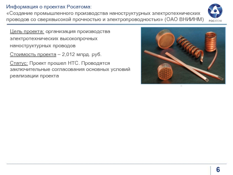 Цель проекта: организация производства электротехнических высокопрочных наноструктурных проводов