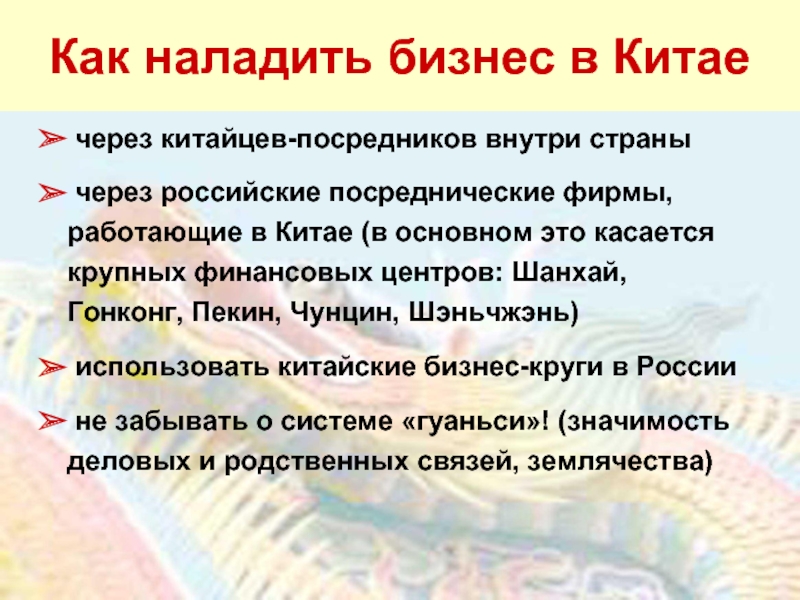не забывать о системе «гуаньси»! (значимость деловых и родственных связей, землячества)