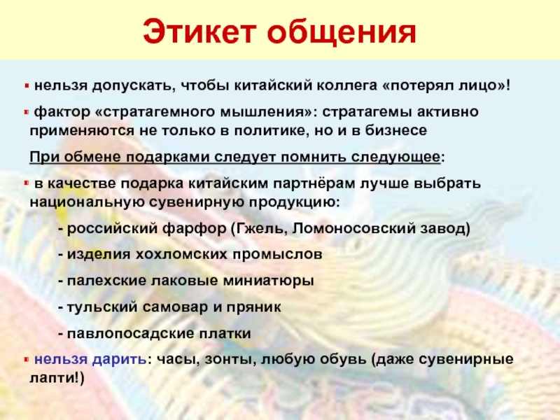 нельзя допускать, чтобы китайский коллега «потерял лицо»!