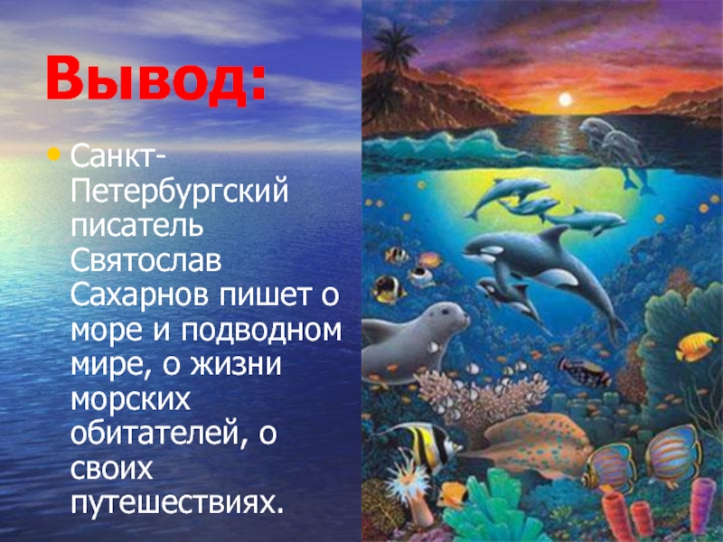 писателей Петербурга, ученик Бианки, создал собственную линию в российской детской литературе: десятки созданных им увлекательных книг посвящены путешествиям и поэзии узнавания своей планеты, ее океанов и материков. Одна из последних работ писателя – «Большая книга знаний о морях и океанах»