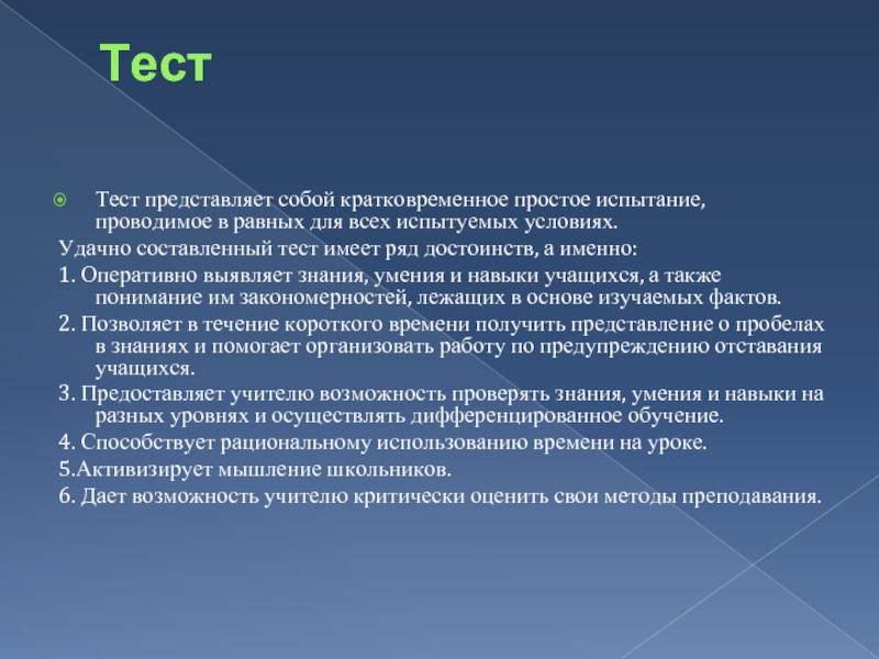 Удачно составленный тест имеет ряд достоинств, а именно: