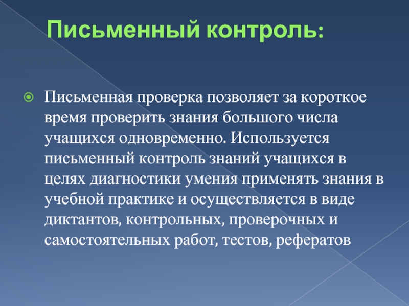 учащихся одновременно. Используется письменный контроль знаний учащихся в целях диагностики умения применять знания в учебной практике и осуществляется в виде диктантов, контрольных, проверочных и самостоятельных работ, тестов, рефератов