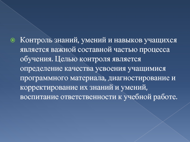 обучения. Целью контроля является определение качества усвоения учащимися программного материала, диагностирование и корректирование их знаний и умений, воспитание ответственности к учебной работе.