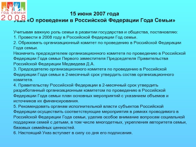 1. Провести в 2008 году в Российской Федерации Год семьи.