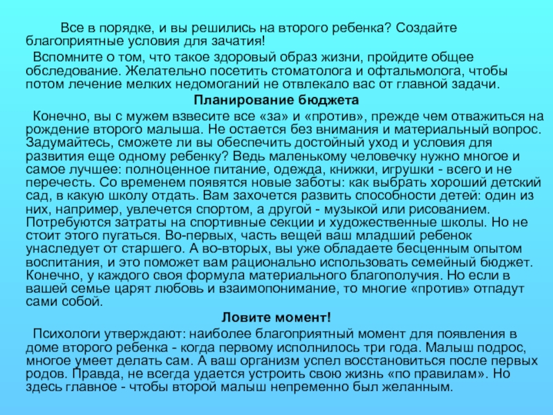 Конечно, вы с мужем взвесите все «за» и «против», прежде чем отважиться на рождение второго малыша. Не остается без внимания и материальный вопрос. Задумайтесь, сможете ли вы обеспечить достойный уход и условия для развития еще одному ребенку? Ведь маленькому человечку нужно многое и самое лучшее: полноценное питание, одежда, книжки, игрушки - всего и не перечесть. Со временем появятся новые заботы: как выбрать хороший детский сад, в какую школу отдать. Вам захочется развить способности детей: один из них, например, увлечется спортом, а другой - музыкой или рисованием. Потребуются затраты на спортивные секции и художественные школы. Но не стоит этого пугаться. Во-первых, часть вещей ваш младший ребенок унаследует от старшего. А во-вторых, вы уже обладаете бесценным опытом воспитания, и это поможет вам рационально использовать семейный бюджет. Конечно, у каждого своя формула материального благополучия. Но если в вашей семье царят любовь и взаимопонимание, то многие «против» отпадут сами собой.