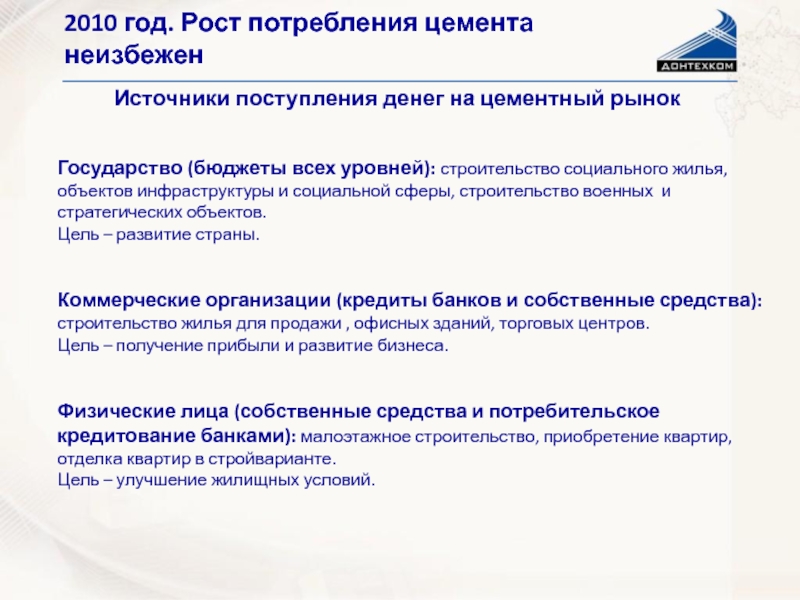 Физические лица – принята Федеральная программа «Малоэтажное строительство», увеличился объем кредитования населения банками, объем построенного индивидуального жилья составил 18,3 млн. кв. м.