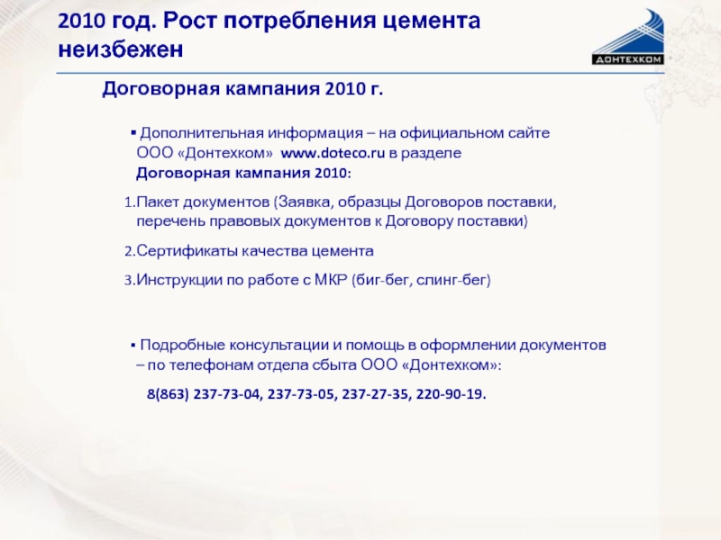Подробные консультации и помощь в оформлении документов – по телефонам отдела сбыта ООО «Донтехком»: