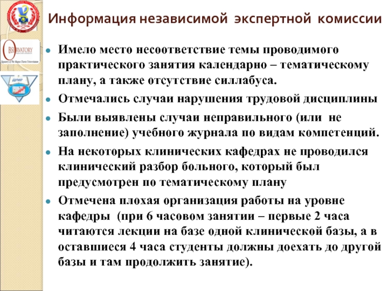 Отмечена плохая организация работы на уровне кафедры (при 6 часовом занятии – первые 2 часа читаются лекции на базе одной клинической базы, а в оставшиеся 4 часа студенты должны доехать до другой базы и там продолжить занятие).