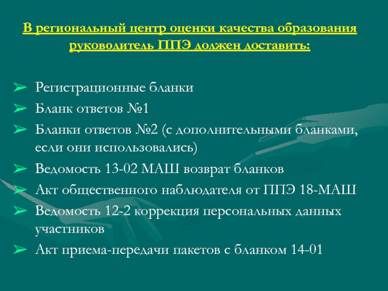 Слайд 26В региональный центр оценки качества образования руководитель ППЭ должен доставить: