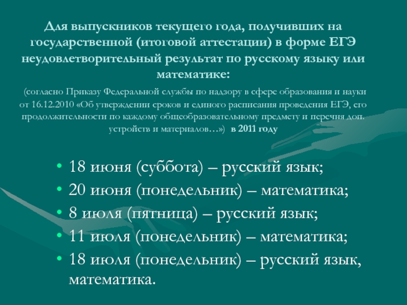 (согласно Приказу Федеральной службы по надзору в сфере образования и науки от 16.12.2010 «Об утверждении сроков и единого расписания проведения ЕГЭ, его продолжительности по каждому общеобразовательному предмету и перечня доп. устройств и материалов…») в 2011 году