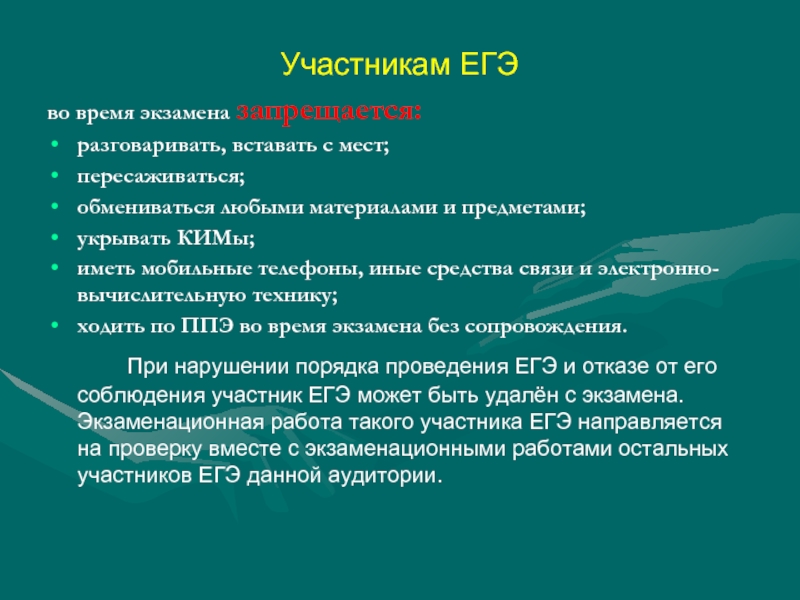 участники ЕГЭ разговаривали, вставали с мест, пересаживались, обменивались любыми материалами и предметами; пользовались моб. телефонами, иными средствами связи и электронно-вычислительной техникой; справочными материалами, кроме разрешенных; ходили по ППЭ во время экзамена без сопровождения дежурных организаторов