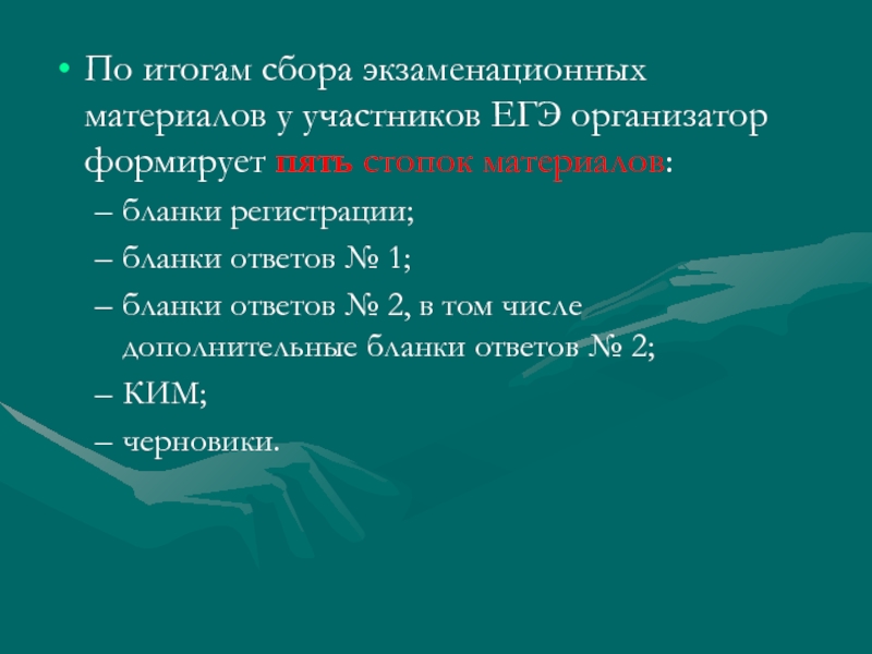 Слайд 10По итогам сбора экзаменационных материалов у участников ЕГЭ организатор формирует пять