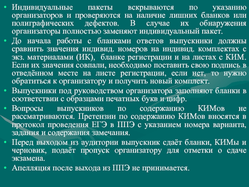 Слайд 9После начала экзамена организаторы собирают неиспользованные индивид. комплекты, фиксируют их количество