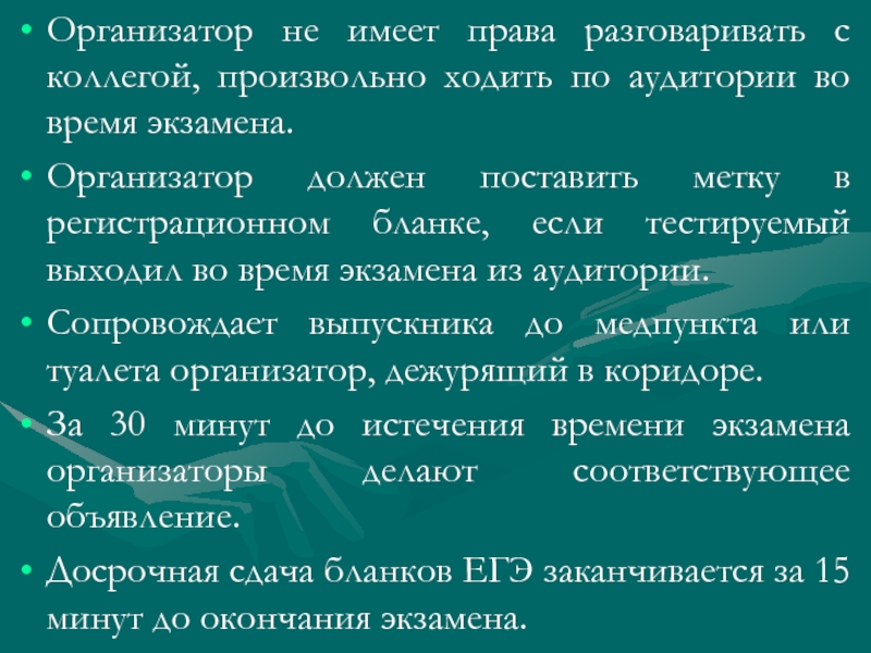 За 30 минут до окончания экзамена ответств. организатор должен уведомить об этом участников. Если участник выполнил работу ранее установленного срока, то организаторы могут принимать экз. материалы до окончания экзамена. Участники ЕГЭ могут покинуть аудиторию и ППЭ