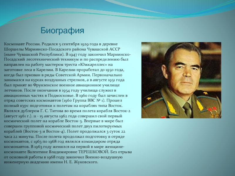 района Чувашской АССР (ныне Чувашской Республики). В 1947 году закончил Мариинско-Посадский лесотехнический техникум и по распределению был направлен на работу мастером треста «Южкареллес» на заготовке леса в Карелии. В Карелии проработал до 1950 года, когда был призван в ряды Советской Армии. Первоначально занимался на курсах воздушных стрелков, а в августе 1951 года был принят во Фрунзенское военное авиационное училище летчиков. После окончания в 1954 году училища служил в авиационных частях в Подмосковье. В 1960 году был зачислен в отряд советских космонавтов (1960 Группа ВВС № 1). Прошел полный курс подготовки к полетам на кораблях типа Восток. Являлся дублером Г. С. Титова во время полета корабля Восток-2 (август 1961 г.). 11 - 15 августа 1962 года совершил свой первый космический полет на корабле Восток-3. Впервые в мире был совершен групповой космический полет двух пилотируемых кораблей (Восток-3 и Восток-4). Полет продолжался 3 суток 22 часа 22 минуты. После полета продолжал подготовку в отряде космонавтов, с 1963 по 1968 год являлся командиром отряда космонавтов. В 1963 году женился на первой в мире женщине-космонавте Валентине Владимировне ТЕРЕШКОВОЙ. Без отрыва от основной работы в 1968 году закончил Военно-воздушную инженерную академию имени Н. Е. Жуковского.
